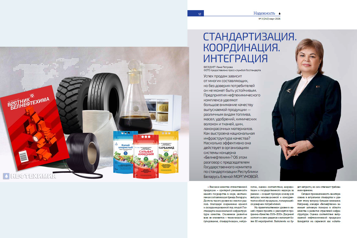 Как выстроена национальная инфраструктура качества? Насколько эффективно она действует в организациях системы концерна «Белнефтехим»? Об этом корреспондент журнала “Вестник Белнефтехима” поговорила с председателем Госстандарта Еленой Моргуновой.
