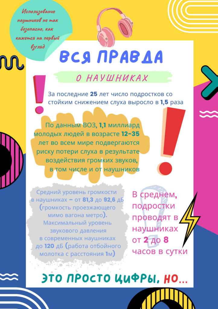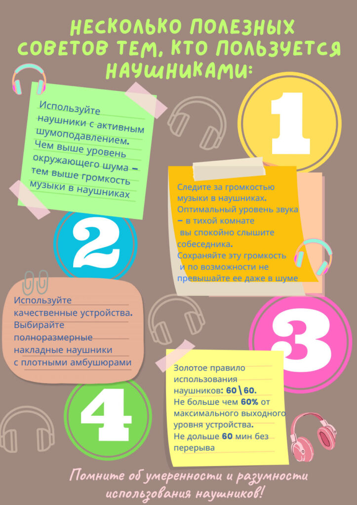 Следует ограничить время прослушивания звуковой информации в наушниках – не более 60 минут подряд и не больше 120 минут в сутки. Старайтесь не превышать порог громкости более 60-65 децибел, как правило, это составляет около 60% от максимально возможного на звуковом устройстве. Рекомендуется отказаться от вакуумных наушников, наушников-капель в пользу накладных, поскольку первые могут не только спровоцировать тугоухость, но также раздражение и воспаление кожных покровов слухового прохода. Особенно такой вид наушников не подходит аллергикам и диабетикам. Не используйте наушники в метро и других местах с высоким уровнем шума. В таких ситуациях чтобы услышать звук вы вынуждены использовать уровень звука выше рекомендуемого.
